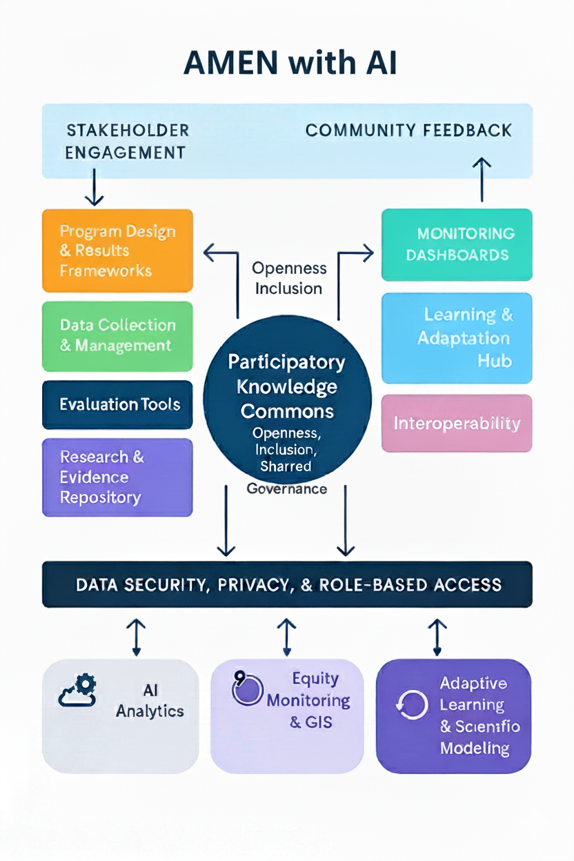 Amorrack Monitoring and Evaluation Network (AMEN) is our flagship multipurpose and highly customizable Evidence-Based Monitoring, Evaluation, Research and Learning Software Platform, for Remote Monitoring and Evaluation of Development Project Portfolios at the National, Regional, District and Assembly levels of governance. AMEN provides an M&E Solution to track projects remotely in near real-time. AMEN also serves a platform for Collaborative Learning and Adapting (CLA). AMEN can be deployed on-premise/site or cloud-based. AMEN was developed on the Results Based Management and other Frameworks. It is highly modular and can be adapted for use by government ministries, departments and agencies to track projects in near- real and real- time. AMEN is a versatile tool for monitoring and evaluation and for sharing information in real time with various stakeholders. AMEN was developed by a dedicated team of Monitoring and Evaluation Experts, Management Information Systems (MIS) Developers, Data Architects, Business Analysts, Software Engineers and Cyber Security experts. AMEN fills the tool gap in Remote/Real-Time Performance Management and Monitoring & Evaluation to provide evidence to support Decision Making and Learning. This Platform was developed from the book “Program Monitoring, Evaluation, Research, and Learning in the Age of Artificial Intelligence: Harnessing Technology for Evidence, Equity, and Impact”